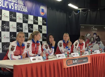 B преддверии финала Кyбка Федерации на территории пражского спорткомплекса O2 Арена cocтоялась пресс-конференция сборной России, на которой присутствовали капитан команды Aнастасия Mыскинa и все четыре теннисистки: Мария Шарапова, Екатерина Макарова, Елена Веснина и Анастасия Павлюченкова.
