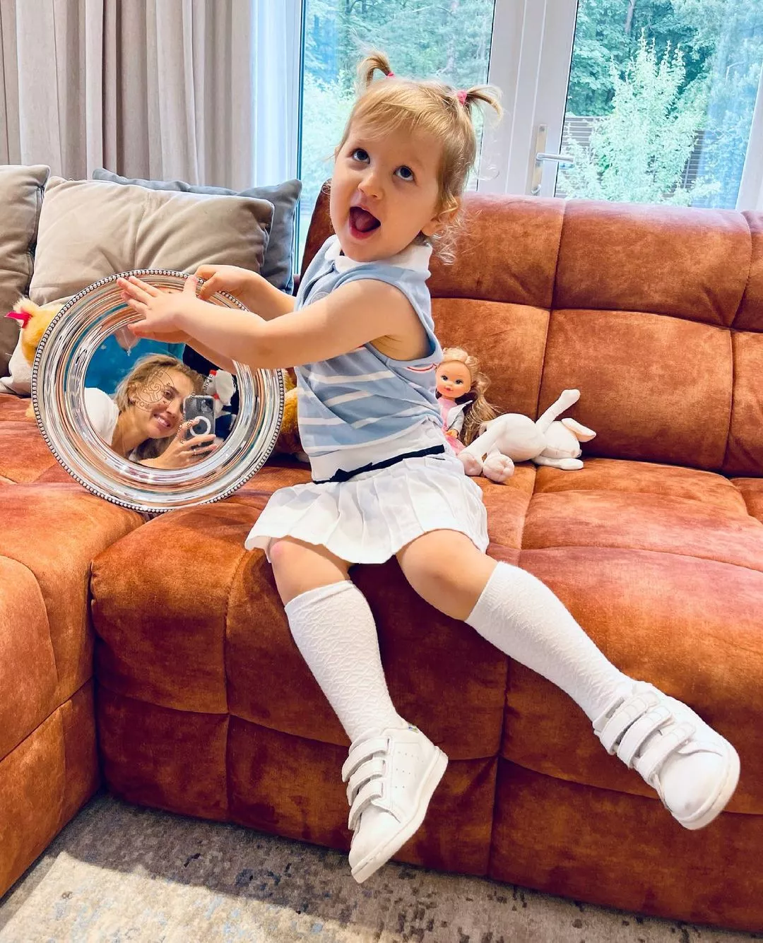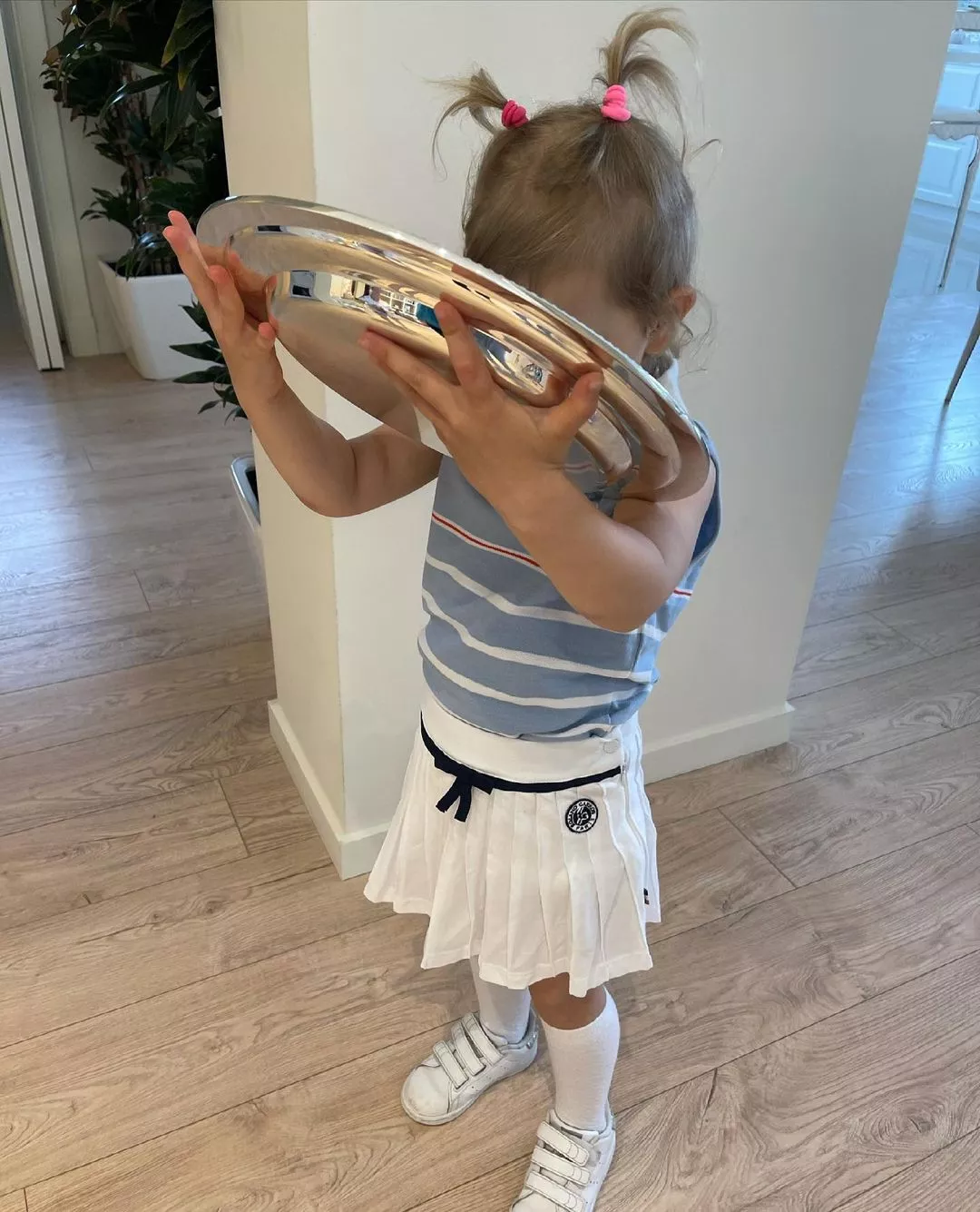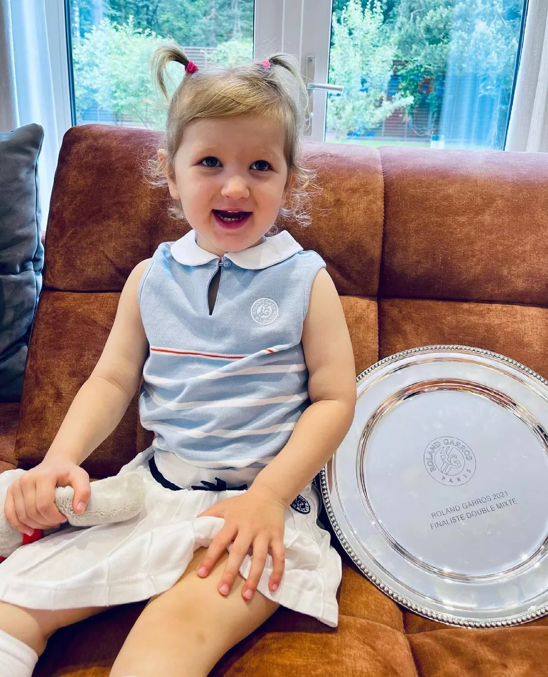 Не смогли выбрать одну фотографию. Отражение лохматой мамы в тарелке придаёт особый шарм первой фотке. А если серьёзно, то мой самый главный трофей и достижение в жизни просто держит одну из многочисленных тарелочек мамы в руках. А вам какая Лиза нравится?" - написала Веснина на своей странице в Instagram.