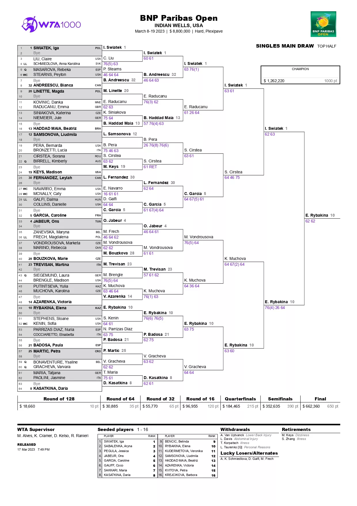 Сетка турнира WTA 1000 в Индиан-Уэллсе
