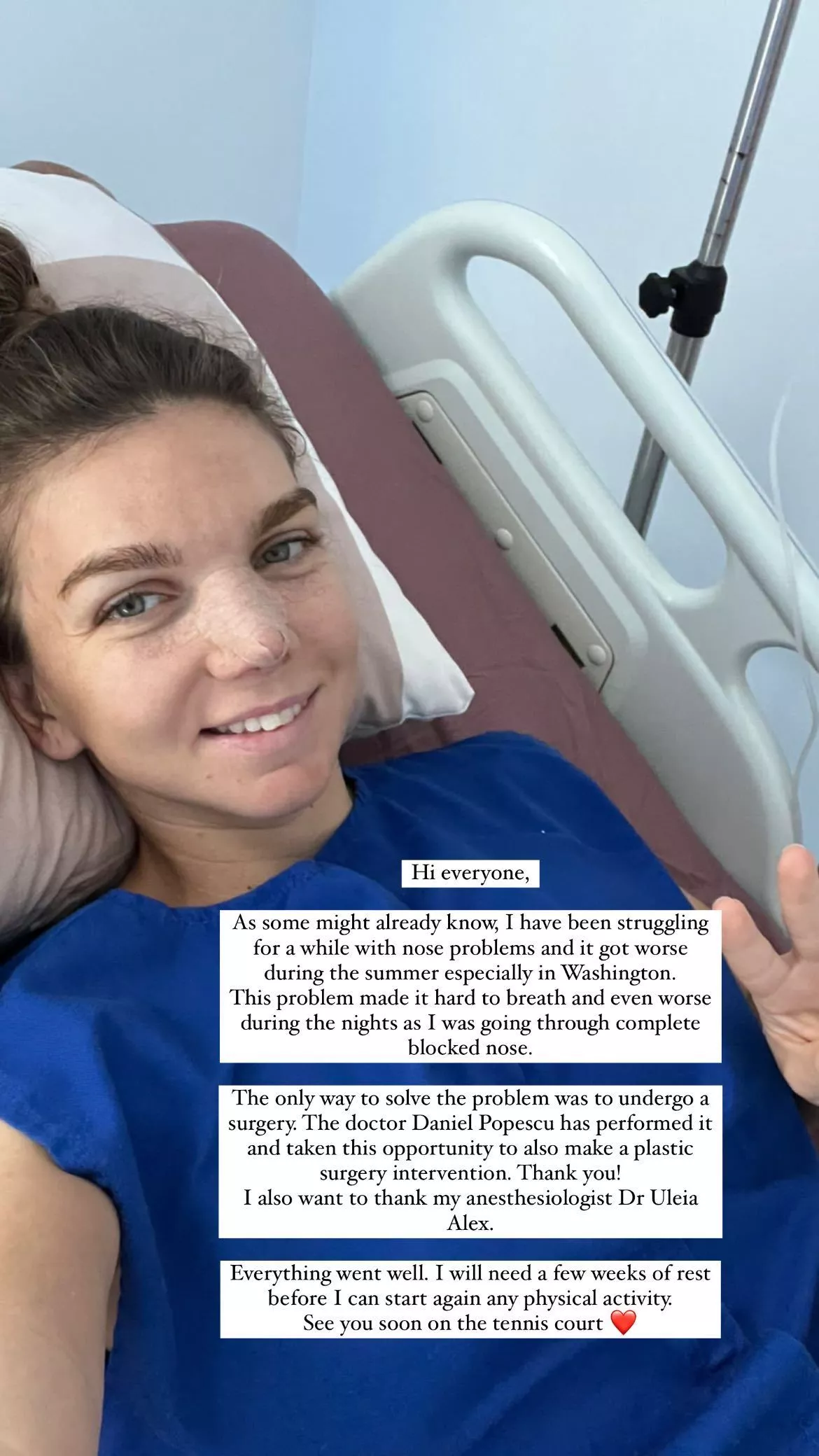 Всё прошло хорошо. Теперь мне потребуется несколько недель отдыха, прежде чем вернуться к физическим нагрузкам. Скоро увидимся на корте", - написала Халеп в соцсетях.