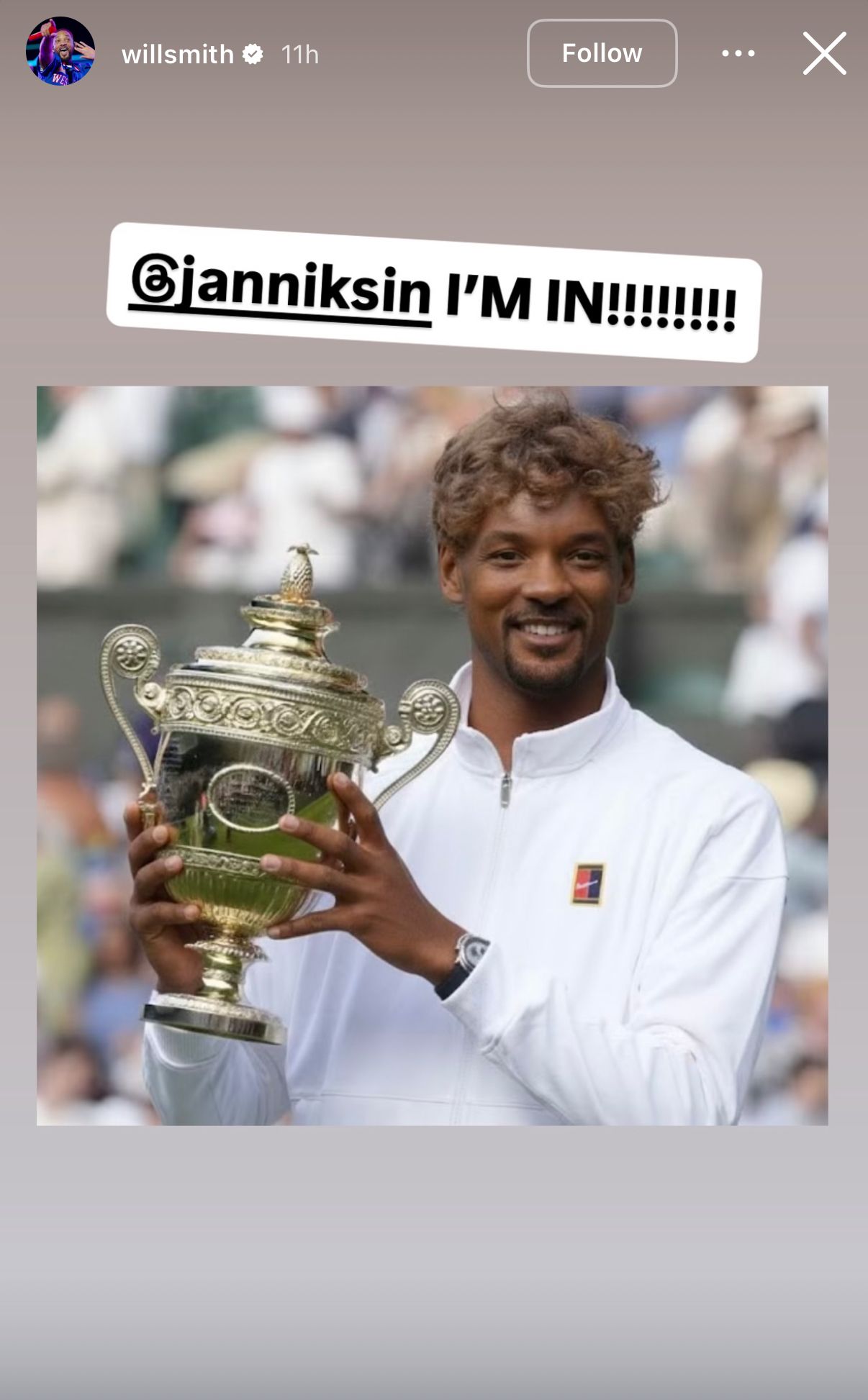 Уилл Смит сделал репост публикации со словами Синнера. Затем опубликовал фотографию, на которой его лицо прифотошоплено к фото Синнера с чемпионским титулом Уимблдона-2025.